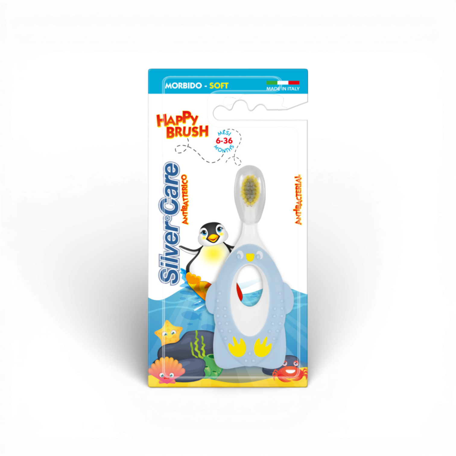 Silver Care Happy Brush is specially designed for babies aged 6–36 months. Featuring ultra-soft bristles, it ensures gentle and safe cleaning for delicate gums and first teeth. The antibacterial protection helps maintain hygiene between uses, while the ergonomic penguin-shaped handle provides an easy and secure grip for little hands. Made in Italy for quality and safety standards.