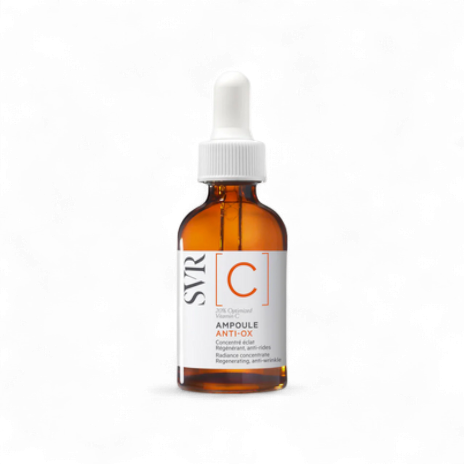 SVR C Ampoule Anti-Ox is a concentrated brightening serum enriched with stabilized vitamin C and antioxidant actives to boost skin radiance and vitality. It helps fight signs of fatigue, uneven tone, and dullness while protecting the skin from oxidative stress and environmental damage. With regular use, skin appears firmer, smoother, and visibly more luminous. Its lightweight, fast-absorbing texture makes it ideal for daily use under moisturizer or makeup. Made in France.