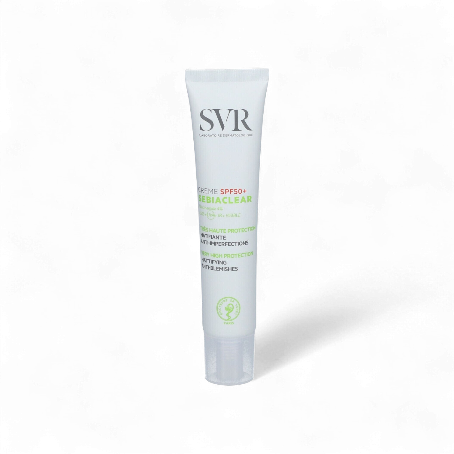 SVR Sebiaclear Cream SPF 50+ is a dual-action sun protection and skincare treatment designed specifically for oily and acne-prone skin. This advanced 2-in-1 formula offers very high protection against UVB, UVA, visible, and infrared rays while actively reducing imperfections, blackheads, and post-acne marks. Enriched with sebum-regulating and mattifying agents, it helps prevent pore clogging and UV-induced rebound breakouts. The lightweight, non-greasy texture provides 8-hour hydration and a smooth matte finish, ideal for daily use as a day cream. Eco-designed with 50% recycled plastic and a 100% recyclable tube, it combines efficacy, skin respect, and environmental care. Made in France.