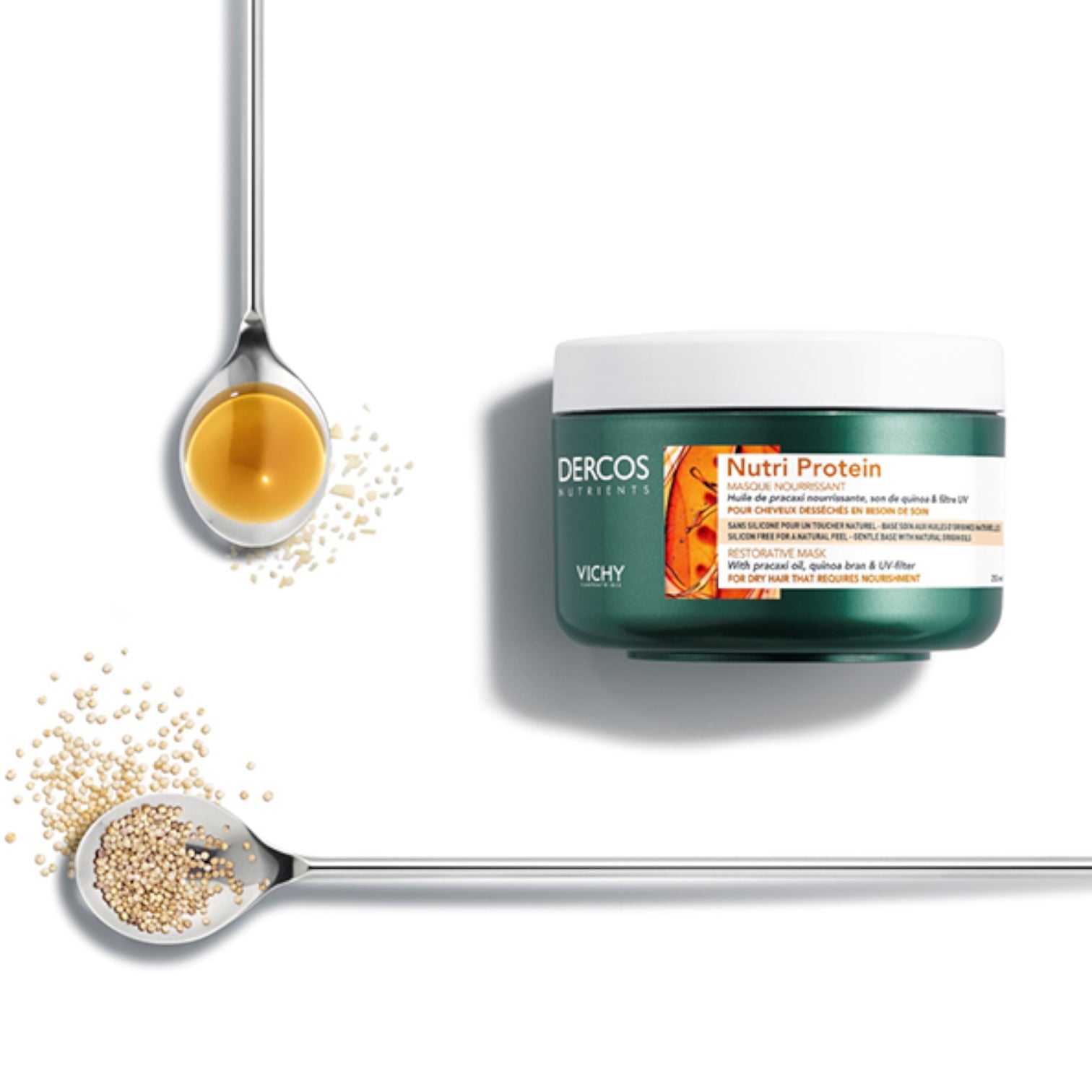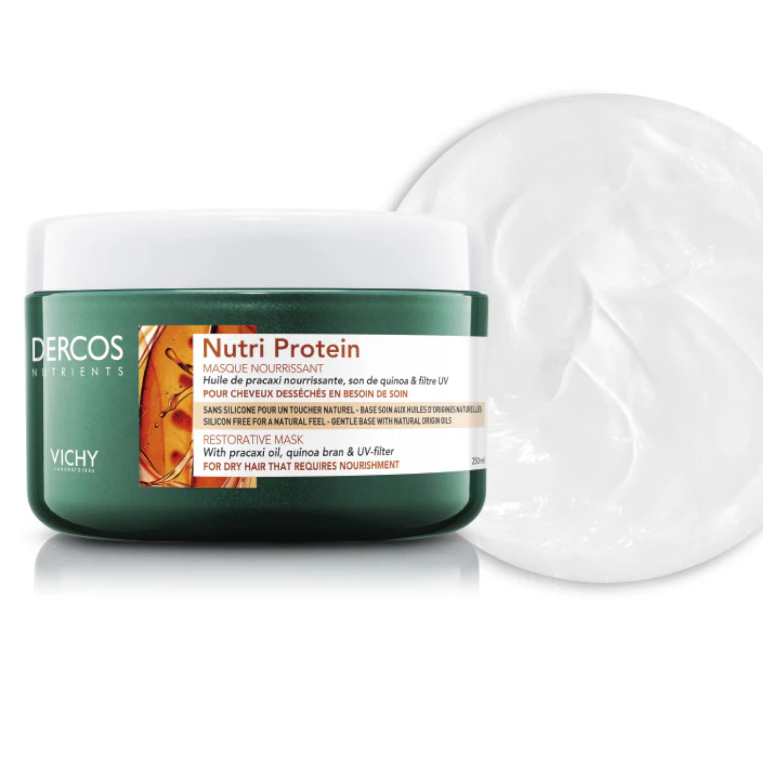 قناع الشعر فيشي ديركوس نيوترينتس بالبروتين مصمم خصيصًا لتغذية الشعر الجاف والتالف بعمق واستعادة حيويته ولمعانه. يحتوي على زيت البراكاكسي الغني بالأوميغا ونخالة الكينوا المرمة لتقوية بصيلات الشعر وترطيبها من الجذور حتى الأطراف. تركيبته الكريمية تغلف الشعرة لتمنحها نعومة فائقة ولمسة حريرية. غنيّ بـ مياه فيشي الحرارية المعدنية التي تعيد التوازن لفروة الرأس وتحمي الشعر من العوامل الخارجية. يُنصح باستخدامه بعد غسل الشعر بشامبو فيشي ديركوس نيوتري بروتين للحصول على أفضل النتائج. مناسب للشعر الجاف والهش